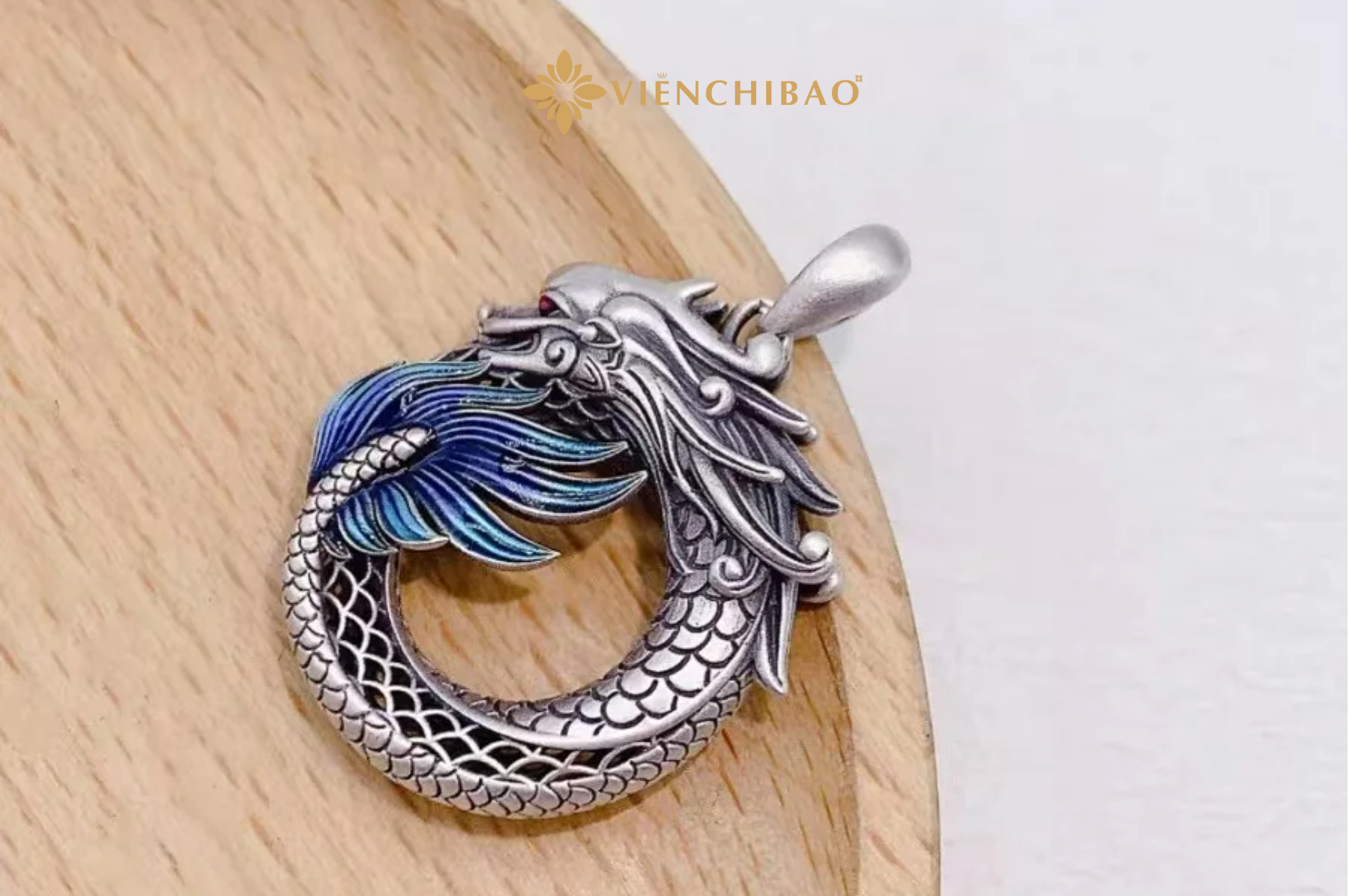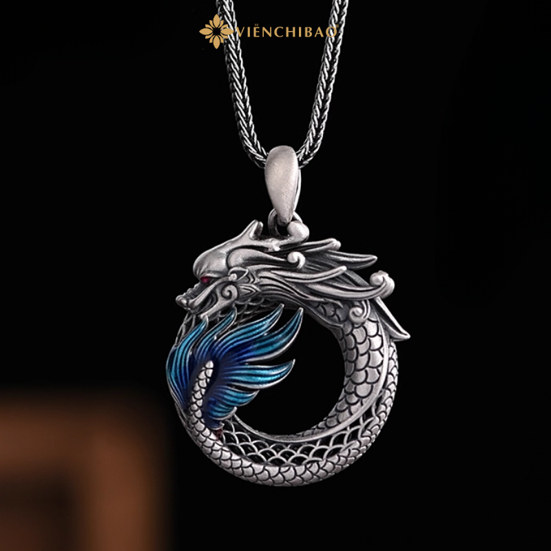 Hoa văn / chi tiết đặc trưng: Hình tượng rồng Thanh Long được chạm khắc nổi bật – từng vảy, sừng, vuốt rồng hiện lên rõ nét trên nền bạc đã được oxy hóa tạo hiệu ứng sâu – giúp mặt dây trông sống động như đang chuyển động. Nền tròn bao quanh khắc chi tiết tạo chiều sâu ánh sáng và hình khối mạnh mẽ.