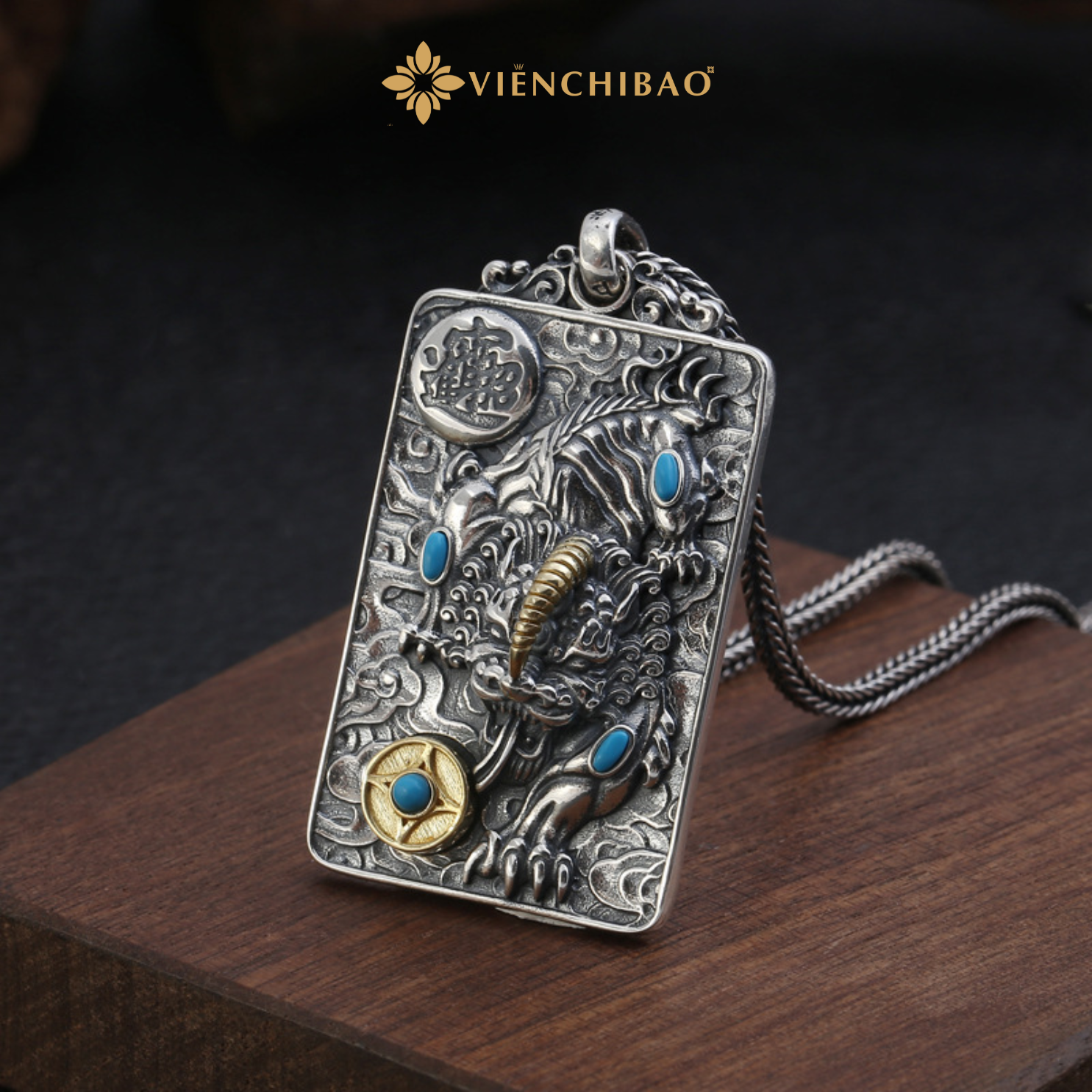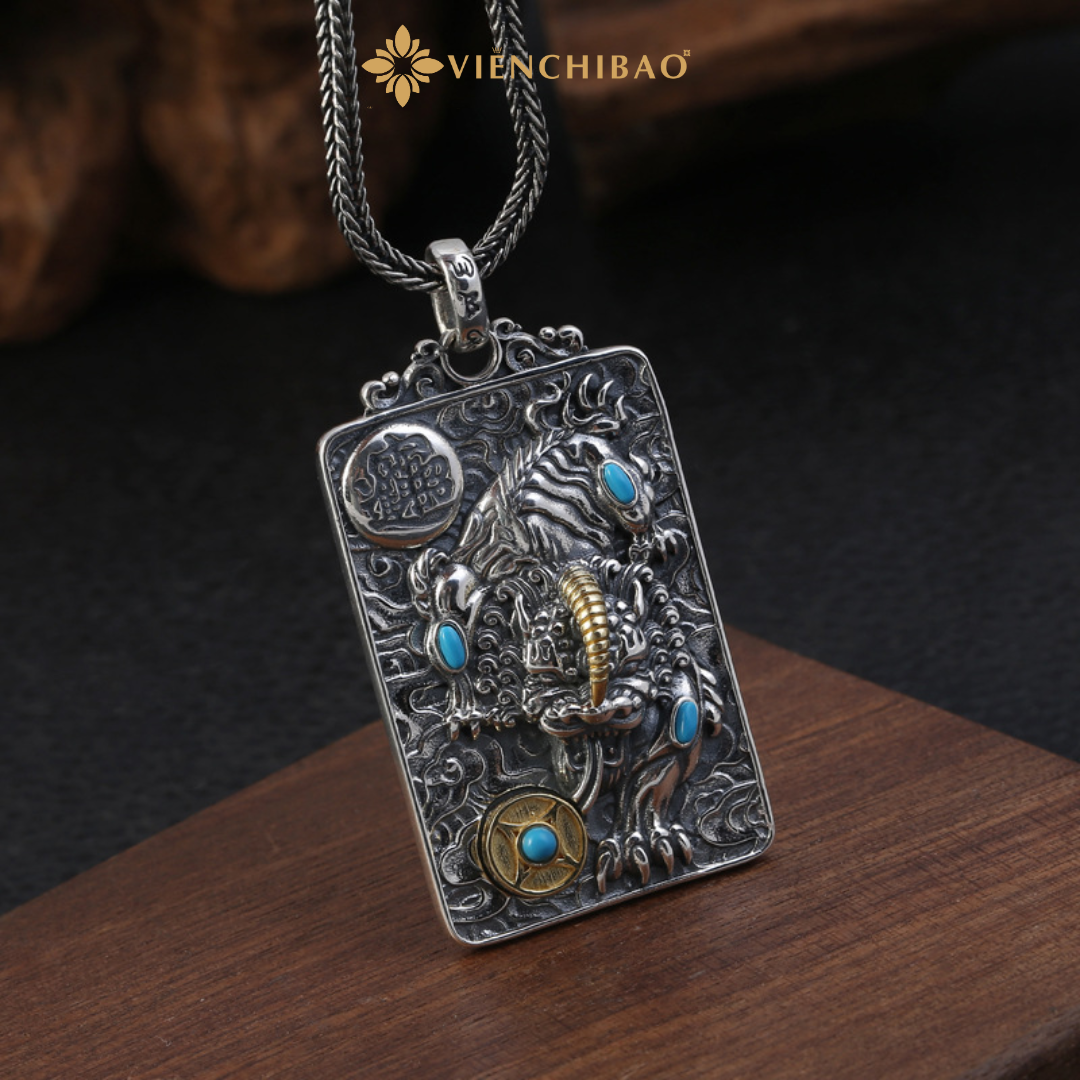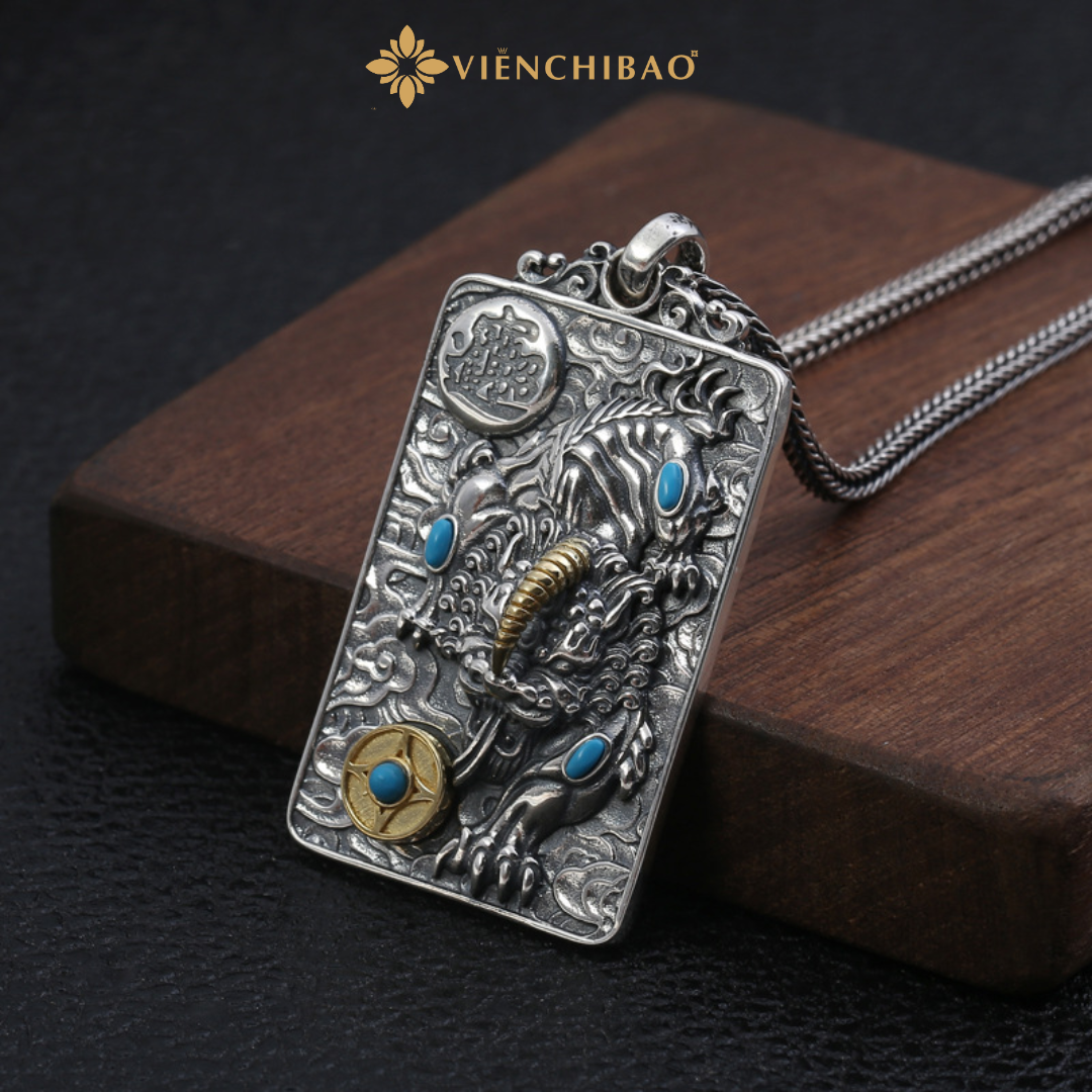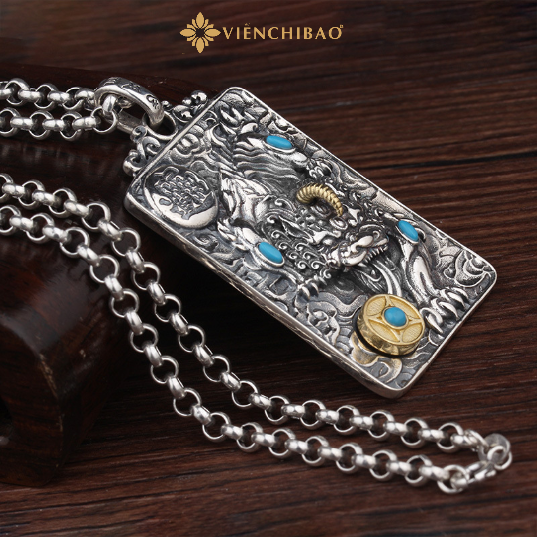 Sản phẩm được chế tác thủ công tỉ mỉ từ bạc S925 cao cấp, kết hợp với kỹ thuật oxy hóa tạo màu cổ điển, điểm xuyết chi tiết đá lam và vàng giả cổ tinh tế. Hình tượng Tỳ Hưu oai nghiêm được khắc chạm sống động, kết hợp với móc Lục Tự đại minh chú – biểu tượng của trí tuệ và năng lượng tích cực.