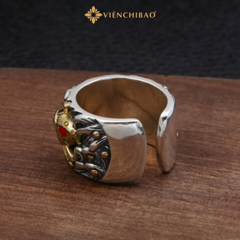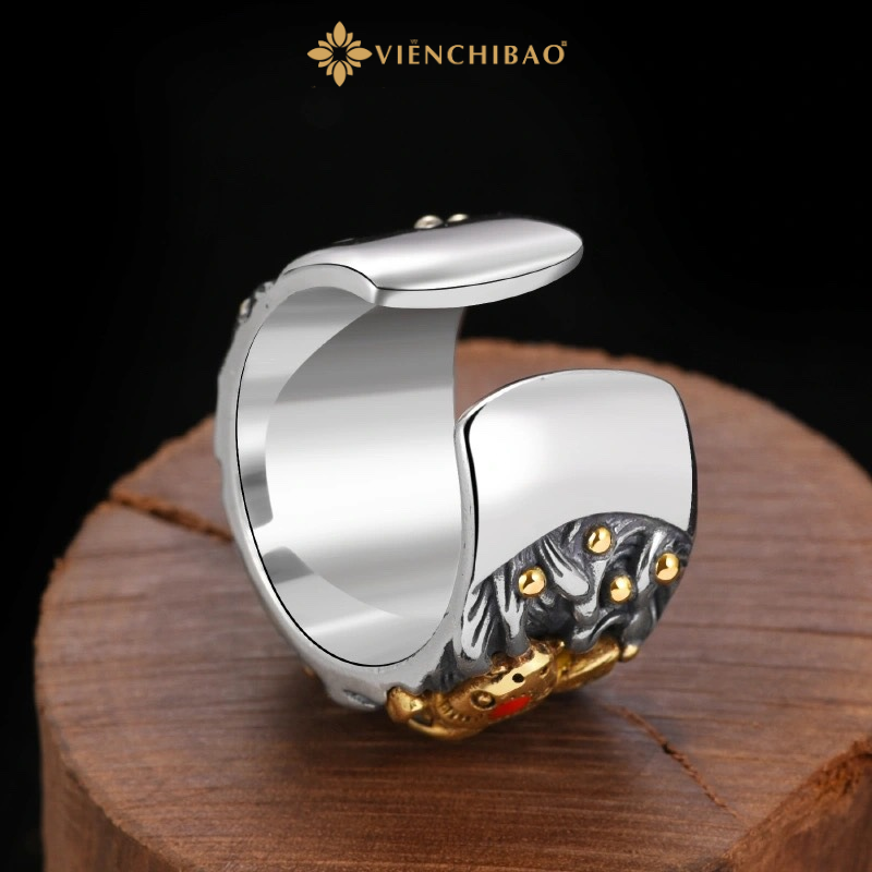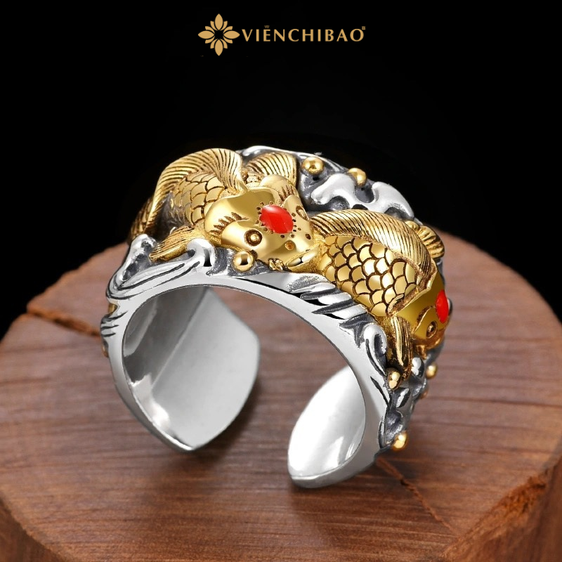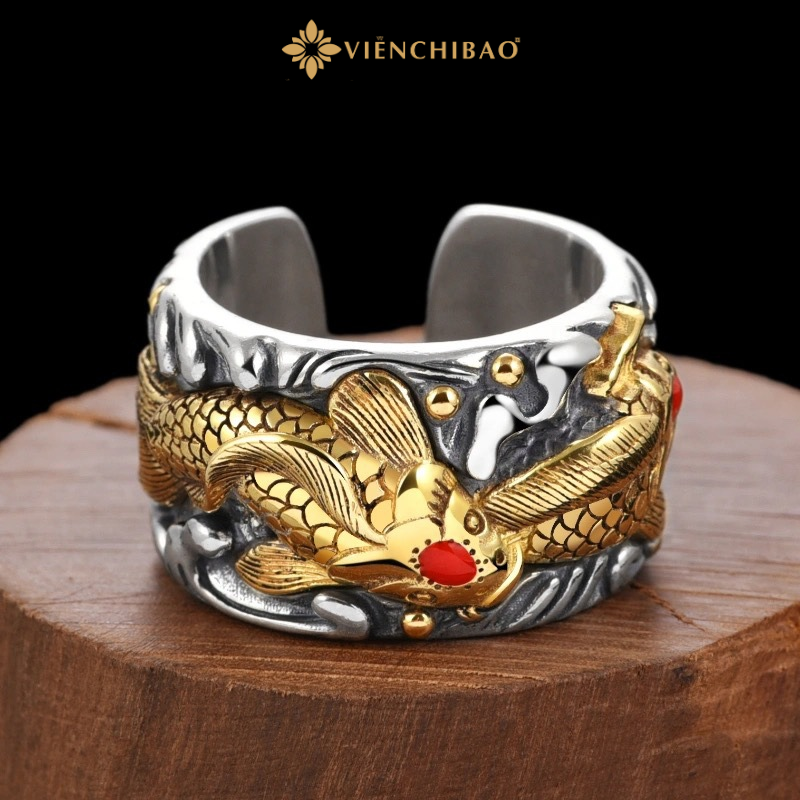 Chiếc nhẫn bạc nam cá chép được chế tác từ bạc Thái S925 nguyên khối, thiết kế bản to mạnh mẽ. Hình tượng cá chép nổi bật ở mặt nhẫn được mạ màu vàng, kết hợp cùng điểm nhấn là đôi mắt cá chép đính đá đỏ, tạo nên vẻ đẹp dứt khoát và quyền uy. Toàn bộ khung nhẫn mang tông màu bạc cổ điển, phối cùng nền sóng nước điêu khắc tỉ mỉ, mang lại cảm giác sống động như một tác phẩm nghệ thuật thu nhỏ.