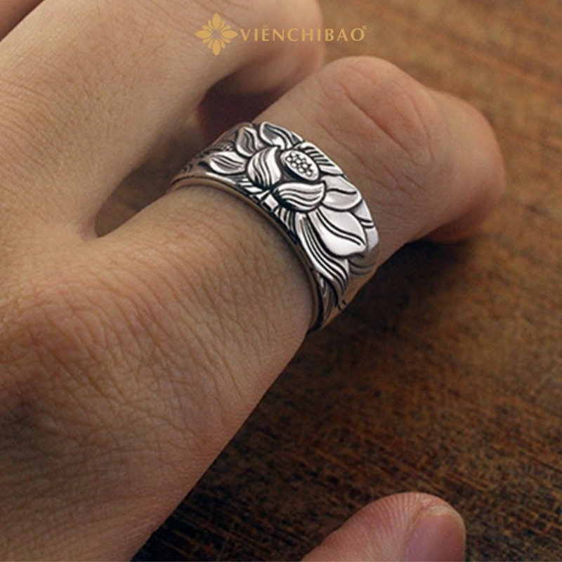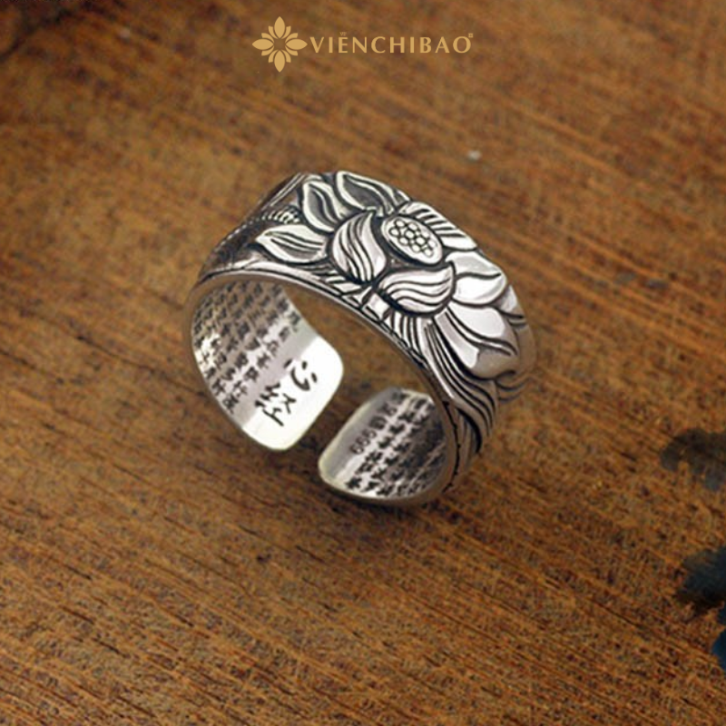 Chiếc nhẫn được chế tác thủ công tinh xảo từ bạc S925 cao cấp, nổi bật với họa tiết hoa sen ở bên ngoài và khắc trọn văn bản Bát Nhã Tâm Kinh ở mặt trong.