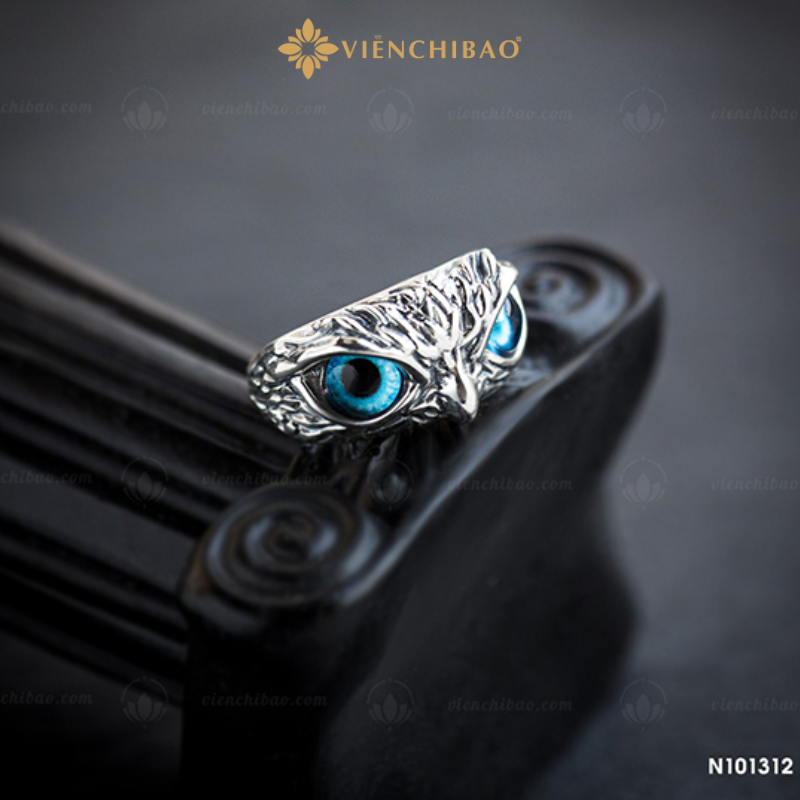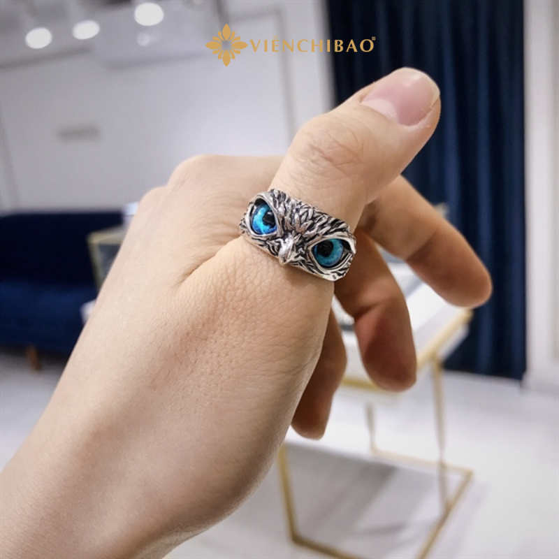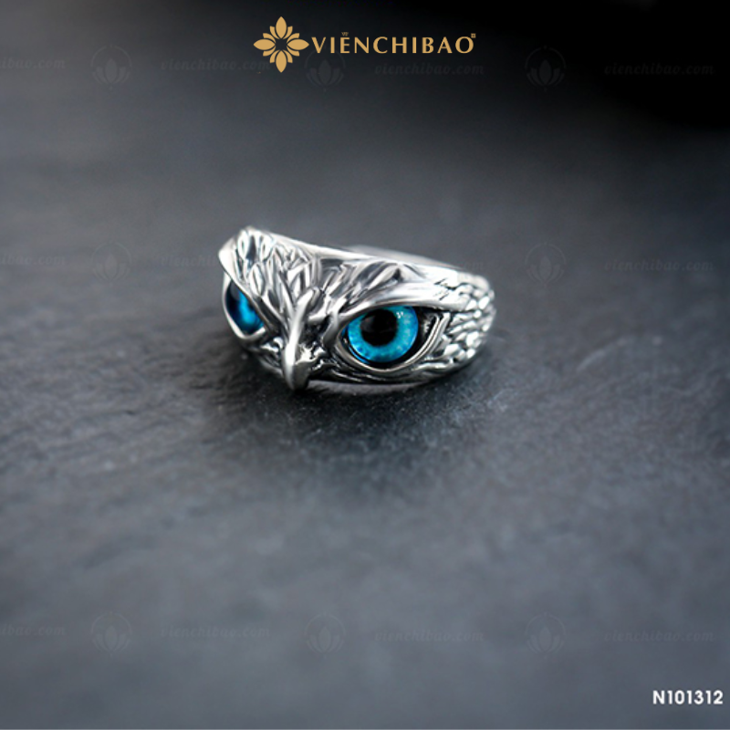 Mỗi đường khắc trên nhẫn được làm thủ công tinh xảo, mô phỏng từng lớp lông và ánh mắt của đại bàng, tạo hiệu ứng sống động và mạnh mẽ. Đôi mắt đá xanh lam chính là điểm nhấn, mang đến cảm giác huyền bí, lạnh lùng nhưng đầy cuốn hút – như thể người đeo đang sở hữu ánh nhìn của một vị “vương giả” thật sự.