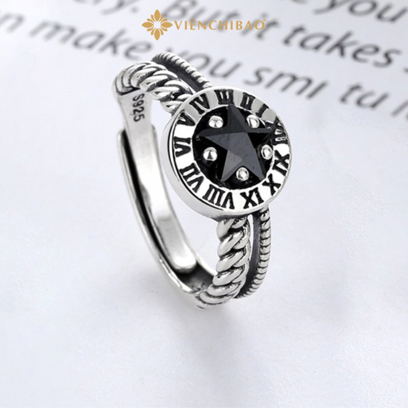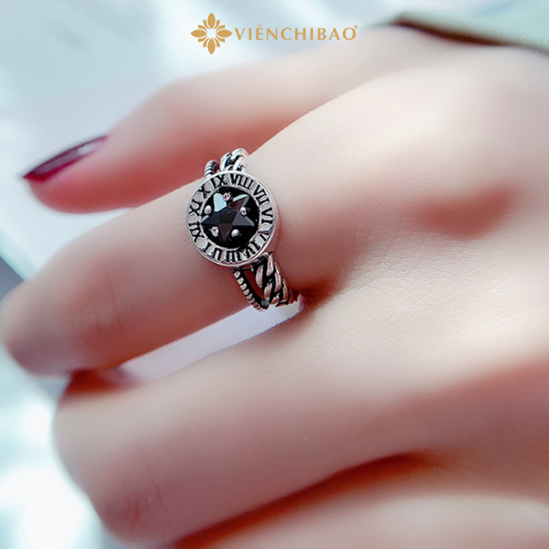 Điểm nổi bật của nhẫn bạc nữ Black Watch nằm ở mặt nhẫn được thiết kế mô phỏng mặt đồng hồ cổ điển, với các con số La Mã được chạm khắc tinh tế bao quanh viên đá đen trung tâm. Viên đá đen được cắt dạng ngôi sao năm cánh, tạo hiệu ứng ánh sáng độc đáo khi nhìn ở các góc độ khác nhau, vừa mang nét huyền bí vừa sang trọng. Thân nhẫn được tạo hình bằng hai sợi dây bạc xoắn song song, tạo cảm giác chắc chắn nhưng vẫn mềm mại và nữ tính. Sự kết hợp giữa gam bạc sáng và đá đen huyền ảo giúp tổng thể chiếc nhẫn vừa cá tính, vừa có chiều sâu nghệ thuật.
