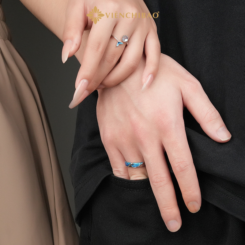 • Thiết kế: Gồm hai phần nhẫn tách biệt – một nhẫn khắc họa cá voi tung sóng với lớp men xanh lấp lánh; một nhẫn mở tinh xảo với đuôi cá voi nhỏ và đá Moon Stone lấp lánh.