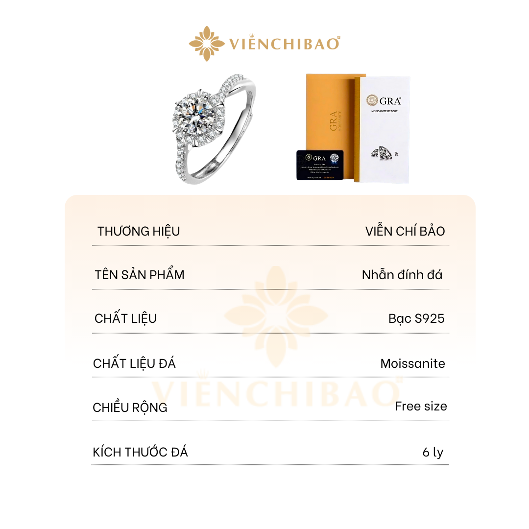 Sản phẩm thuộc dòng trang sức bạc cao cấp của Viễn Chí Bảo, được chế tác thủ công tỉ mỉ từ bạc S925 nguyên chất kết hợp cùng đá Moissanite – loại đá quý có độ sáng gấp nhiều lần kim cương tự nhiên. Chiếc nhẫn là lựa chọn lý tưởng dành cho những cô gái yêu thích sự thanh lịch, tinh tế và cuốn hút.