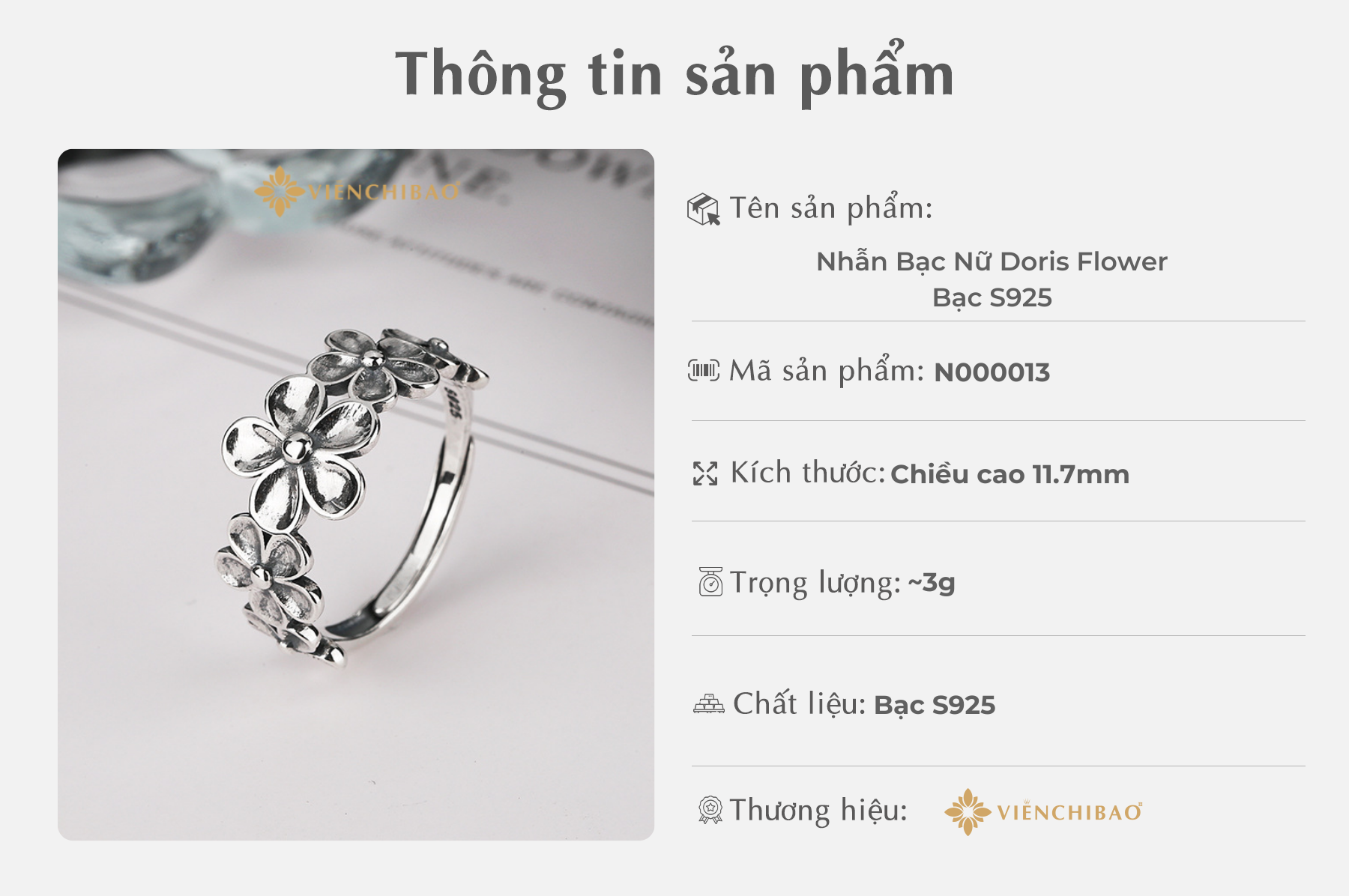 Viễn Chí Bảo luôn tin rằng, mỗi món trang sức không chỉ là một vật phẩm làm đẹp, mà còn là cầu nối giữa trái tim và cảm xúc. Với nhẫn bạc nữ Doris Flower, chúng tôi mong muốn đem đến cho bạn không chỉ vẻ ngoài thanh thoát, mà còn là niềm vui mỗi khi ngắm nhìn đôi tay của chính mình.
