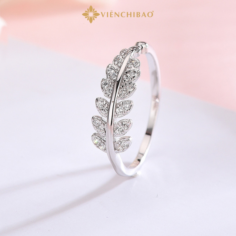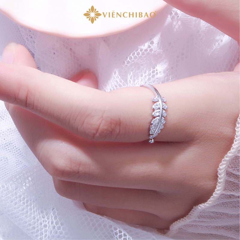 Điểm nổi bật nhất của chiếc nhẫn nằm ở họa tiết dương xỉ uốn cong mềm mại, được đính những viên đá sáng li ti như giọt sương mai đọng trên lá. Thiết kế này tượng trưng cho vẻ đẹp trong trẻo, thanh thuần nhưng vẫn quyến rũ, tôn lên nét nữ tính của đôi tay người đeo.