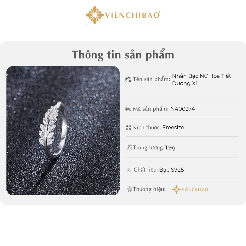 Sản phẩm được chế tác tỉ mỉ bởi đội ngũ thợ kim hoàn tại Viễn Chí Bảo, thương hiệu nổi tiếng với các thiết kế tinh xảo, mang ý nghĩa phong thủy và thẩm mỹ cao. Nhẫn bạc dương xỉ là lựa chọn hoàn hảo dành cho những cô nàng yêu thích phong cách tự nhiên, nhẹ nhàng và sang trọng.