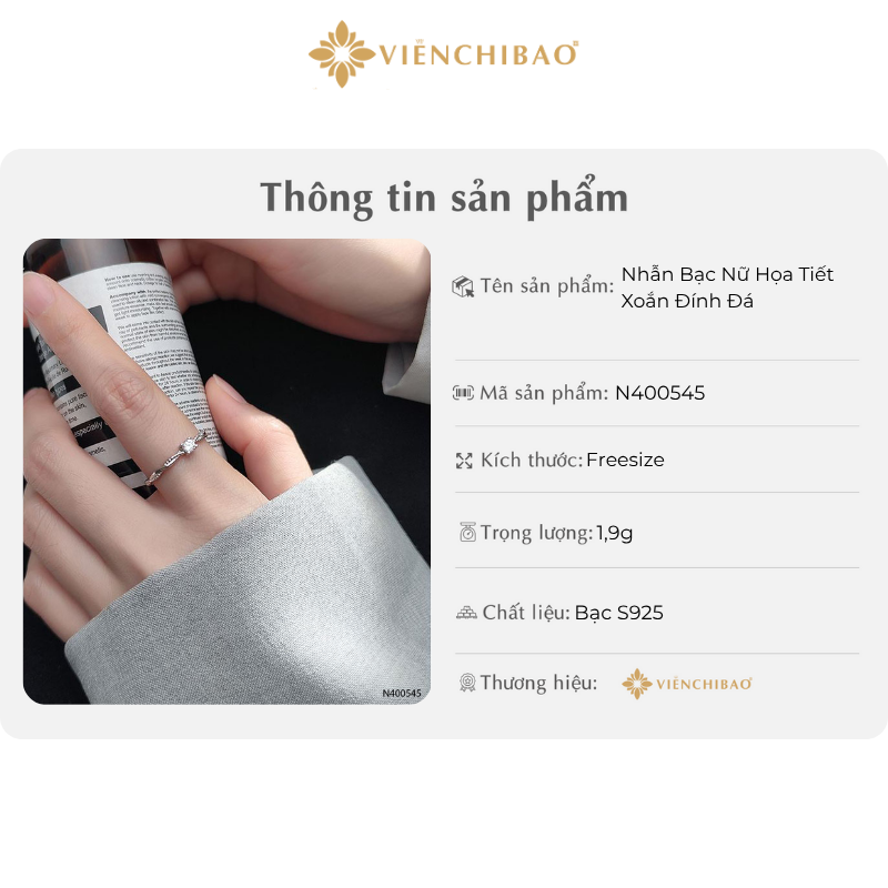 Nhẫn bạc nữ họa tiết xoắn đính đá là một trong những thiết kế được yêu thích nhất tại Viễn Chí Bảo, mang vẻ đẹp thanh thoát, nhẹ nhàng nhưng vẫn tỏa sáng đầy cuốn hút. Lấy cảm hứng từ sự uyển chuyển của dòng chảy cuộc sống, chiếc nhẫn được tạo hình với đường xoắn mềm mại, uốn lượn ôm lấy viên đá sáng ở trung tâm – như biểu tượng của tình yêu, niềm tin và hạnh phúc bền lâu. Mỗi chiếc nhẫn đều được chế tác tỉ mỉ từ bạc S925 cao cấp, giúp tôn lên nét tinh khôi của người phụ nữ và khẳng định gu thẩm mỹ tinh tế trong từng chi tiết.