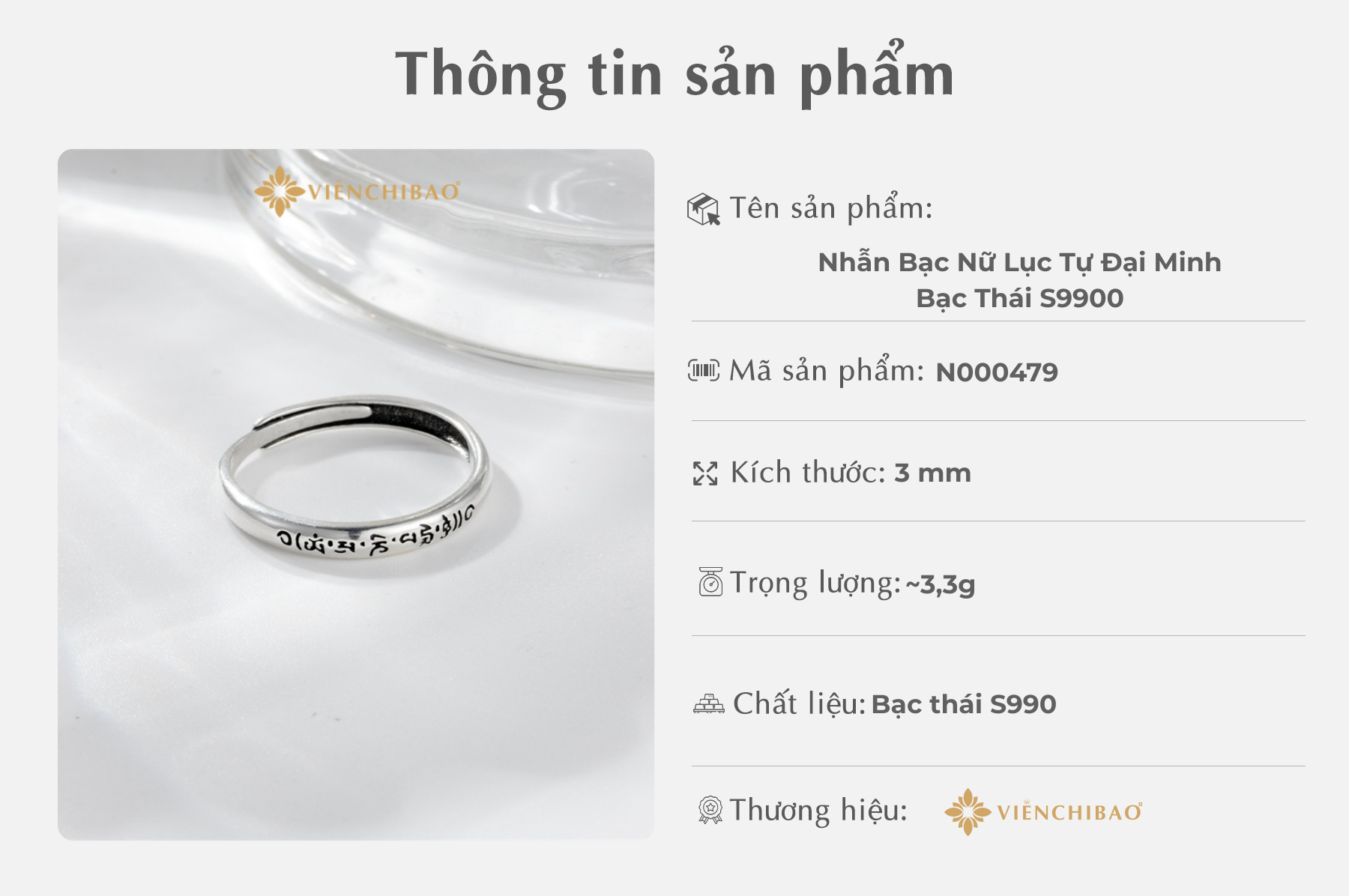Viễn Chí Bảo xin chân thành cảm ơn quý khách đã tin chọn sản phẩm Nhẫn Bạc Nữ Lục Tự Đại Minh – Bạc Thái S990. Mỗi chiếc nhẫn được chúng tôi chế tác không chỉ là một món trang sức đơn thuần mà còn là lời gửi gắm về sự an yên, tỉnh thức và lòng từ bi. Hy vọng món quà này sẽ luôn bên bạn như một biểu tượng của sự vững chãi và trí tuệ.