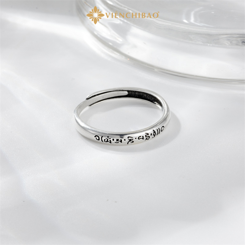 • Thiết kế: Nhẫn bản mảnh, bề mặt khắc tinh xảo Lục Tự Đại Minh Chú bằng ký tự Tây Tạng. Thiết kế hở nhẹ giúp điều chỉnh linh hoạt theo nhiều cỡ tay.