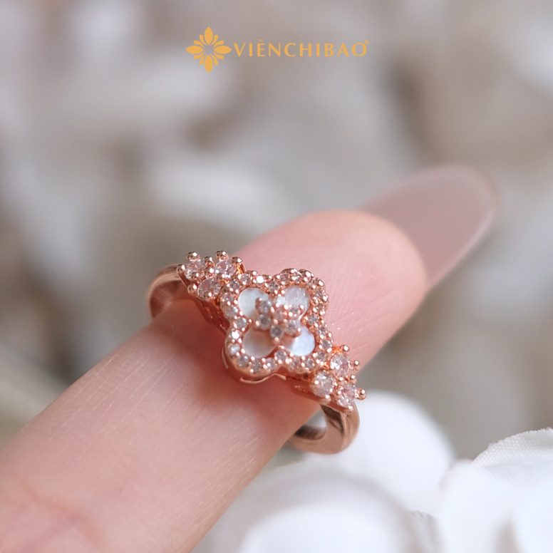 • Kiểu dáng: Nhẫn bản vừa phải với mặt cỏ bốn lá cách điệu, mỗi lá được uốn cong mềm mại, tạo cảm giác chuyển động nhẹ khi đeo.