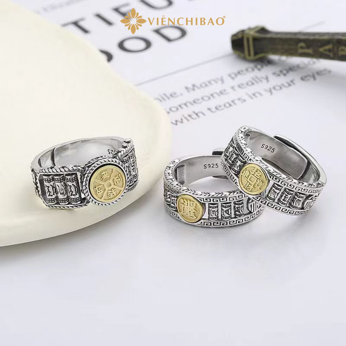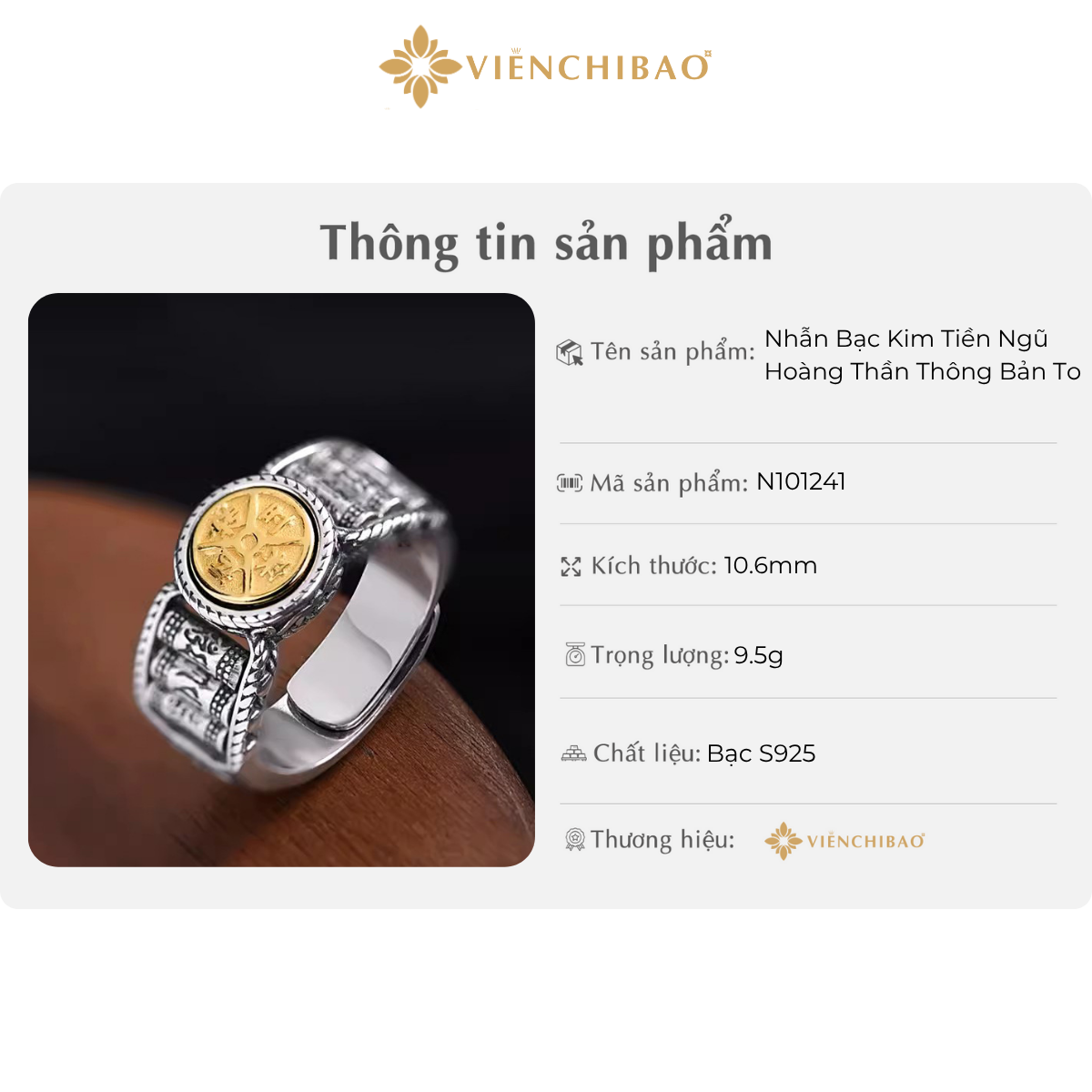 Nhẫn Kim Tiền Ngũ Hoàng Thần Thông Bản To – Bạc Thái S925 là một trong những thiết kế mạnh mẽ và sang trọng bậc nhất của Viễn Chí Bảo, dành riêng cho những người yêu thích phong cách cổ điển mang đậm sắc thái tâm linh phương Đông. Tác phẩm được chế tác hoàn toàn thủ công từ bạc Thái cao cấp S925, điểm nhấn là đồng kim tiền được mạ vàng nổi bật ở trung tâm, biểu tượng cho tài lộc, quyền uy và phúc khí.