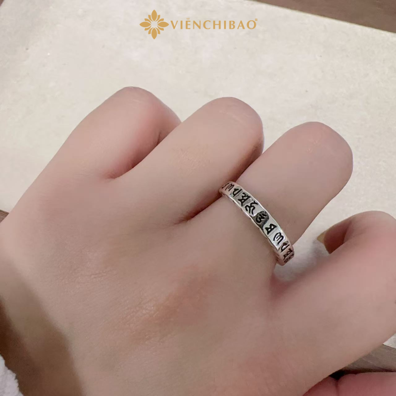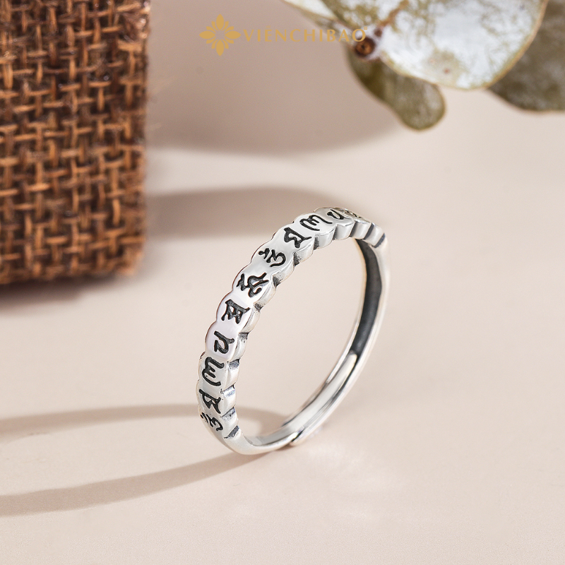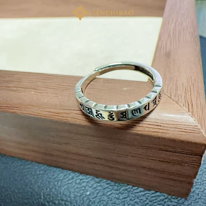 Câu thần chú “Om Mani Padme Hum” khắc nổi quanh thân nhẫn là biểu tượng của lòng từ bi, trí tuệ và sự bảo hộ.