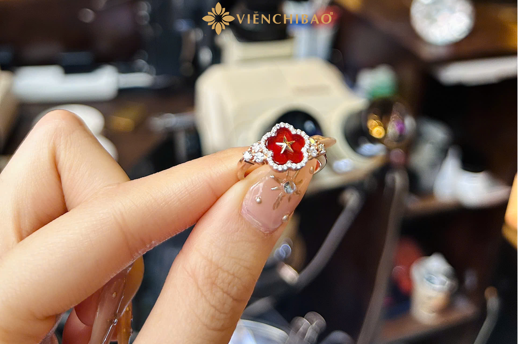 Họa tiết chính của chiếc nhẫn là bông hoa năm cánh màu đỏ, nằm ở vị trí trung tâm. Sắc đỏ rực rỡ không chỉ tạo điểm nhấn bắt mắt mà còn gợi nhắc đến màu cờ thiêng liêng của dân tộc – biểu tượng của sự hy sinh, lòng yêu nước và tinh thần chiến đấu kiên cường. Nổi bật bên trong bông hoa là ngôi sao vàng năm cánh, đại diện cho lý tưởng độc lập, tự do, đoàn kết và niềm tin vào tương lai tươi sáng của đất nước.