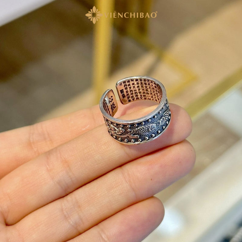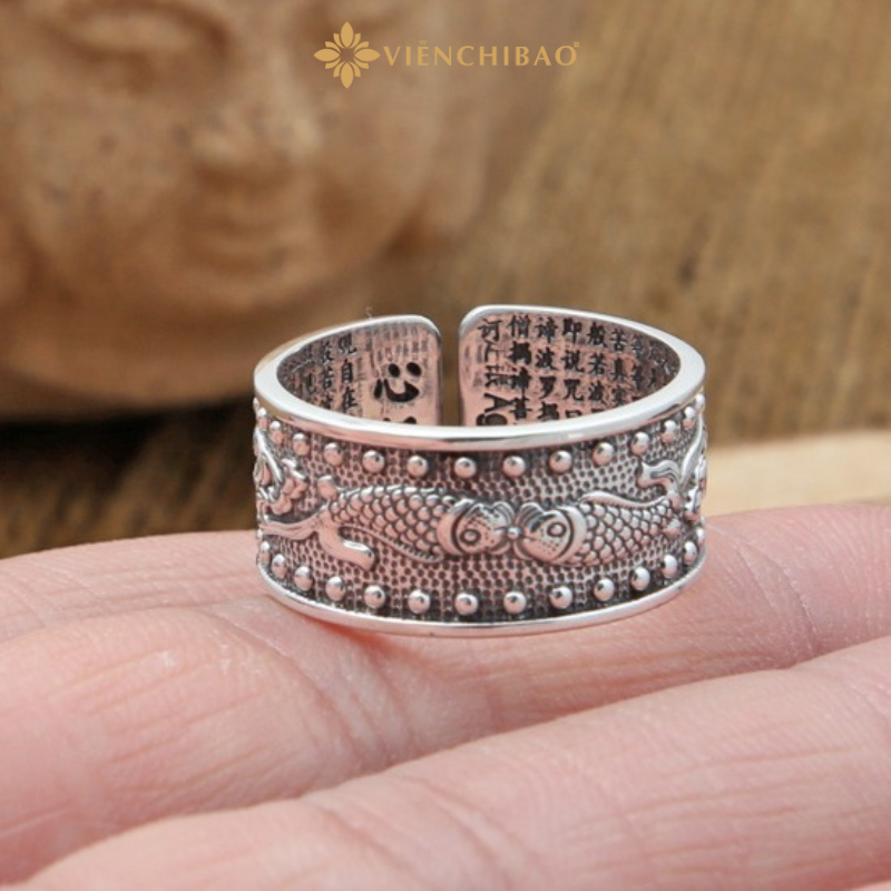 Nhẫn Song Ngư Bát Nhã được chế tác từ bạc S925 – chất liệu bền bỉ, không bị oxi hóa và có độ sáng bóng tự nhiên. Thiết kế đặc biệt với hình ảnh hai con cá được khắc nổi, tạo nên một chiếc nhẫn cá tính và độc đáo. Các họa tiết trên bề mặt nhẫn được hoàn thiện tỉ mỉ, giúp tạo hiệu ứng ánh sáng lung linh khi ánh sáng chiếu vào. Phần trong của nhẫn được chạm khắc các ký tự Bát Nhã Tâm Kinh, tạo nên sự hòa quyện giữa nghệ thuật và triết lý sâu sắc.