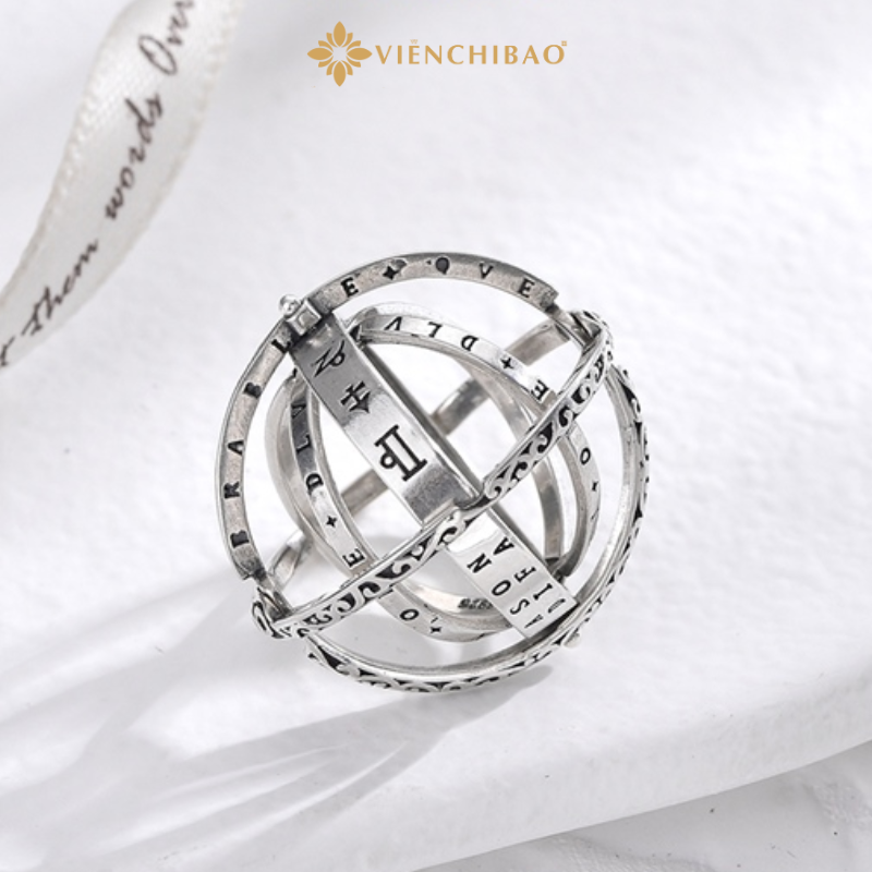 Khi đóng lại, chiếc nhẫn trông như một vòng bạc cổ điển với họa tiết chạm khắc tinh tế. Nhưng khi mở ra, nó lại biến thành một quả địa cầu thu nhỏ – tượng trưng cho vũ trụ, tri thức và sự tự do khám phá. Mỗi vòng tròn bạc tượng trưng cho quỹ đạo của các hành tinh, hòa quyện với những đường khắc ký hiệu thiên văn cổ đại, gợi cảm giác huyền bí và đầy cuốn hút.