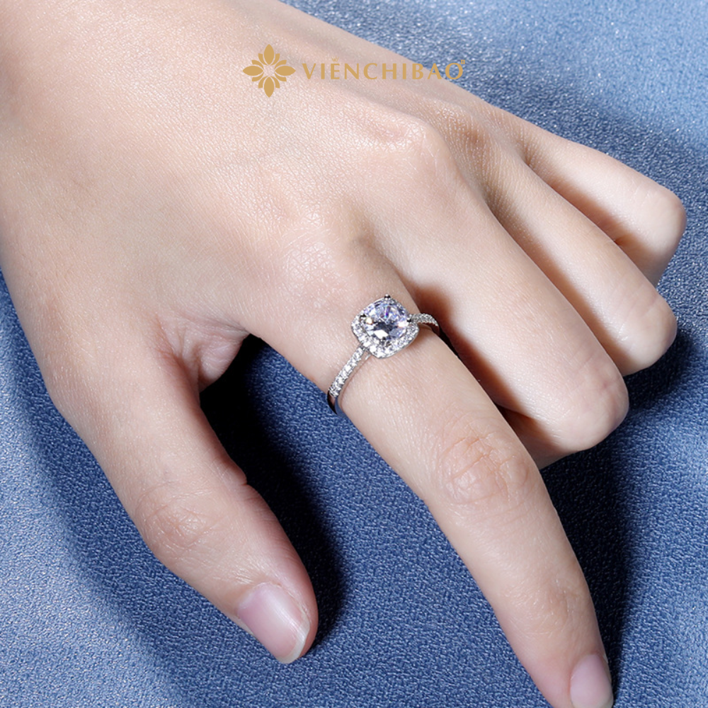 Chi tiết đặc trưng: Tâm điểm là viên đá Moissanite 6.3li được đính chắc chắn trên bề mặt vuông, sở hữu khả năng tán sắc đa màu mạnh mẽ, tạo nên hiệu ứng ánh sáng lộng lẫy như kim cương thật. Bề mặt bạc được xử lý đánh bóng gương thủ công, mang lại độ mịn mượt và sắc sảo trong từng đường kim mũi chỉ.