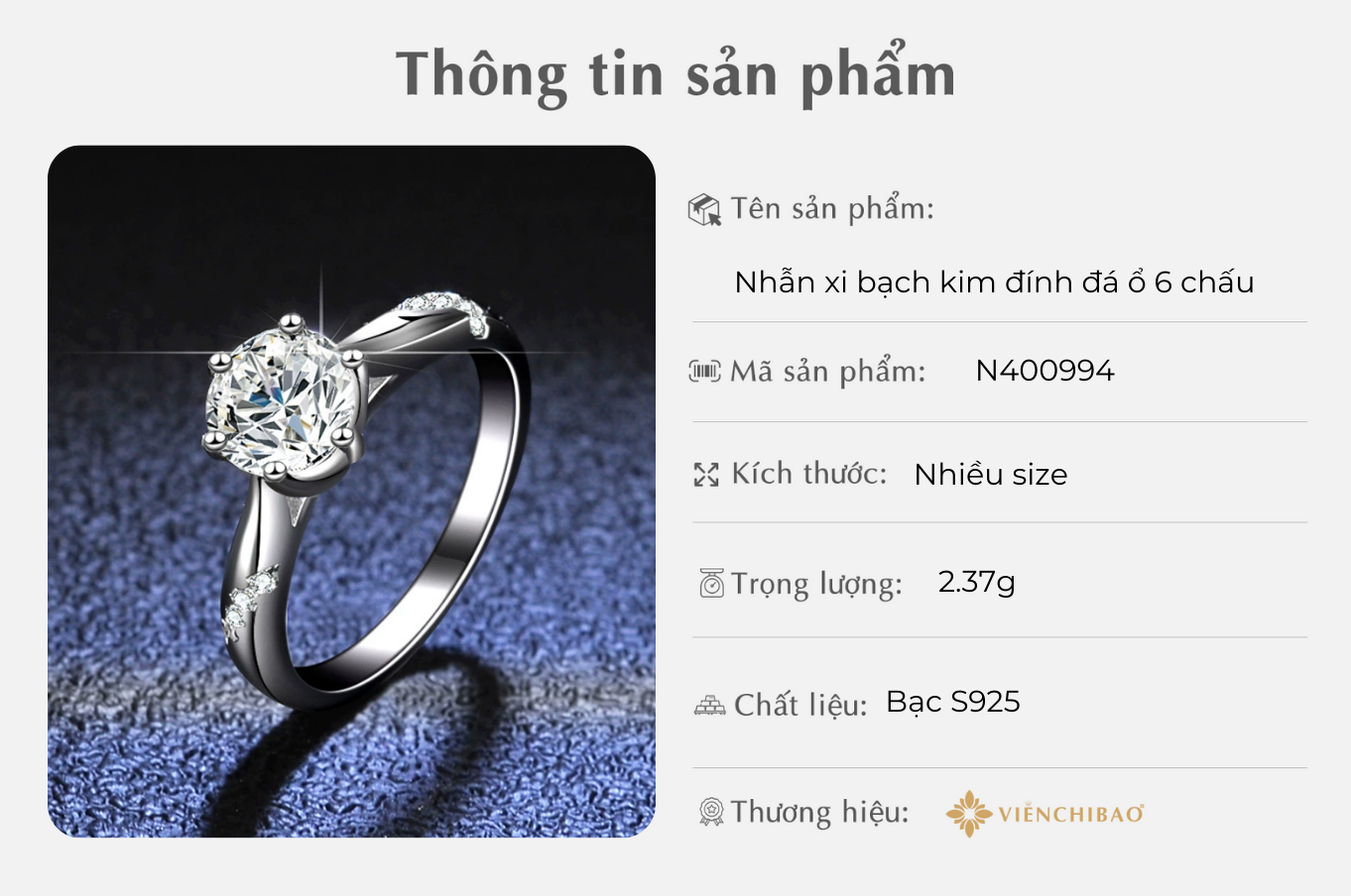 I. THÔNG TIN SẢN PHẨM NHẪN XI BẠCH KIM ĐÍNH ĐÁ 6 CHẤU