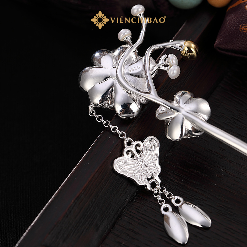 Lấy cảm hứng từ vẻ đẹp ấy, Viễn Chí Bảo đã chế tác nên Trâm Bạc Thái Hoa Mai – Bạc S925, với họa tiết hoa mai nở rộ tinh xảo, điểm nhấn là nhụy vàng cùng các hạt ngọc trai nhỏ xinh, kết hợp chi tiết bướm và lá rủ duyên dáng. Từng đường nét khắc họa đều mang hơi thở cổ điển, giúp người phụ nữ tỏa sáng với vẻ đẹp thanh thoát và dịu dàng.