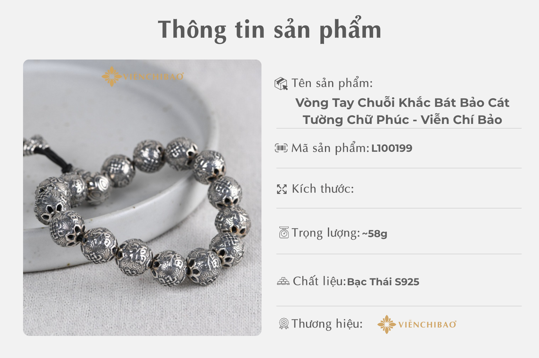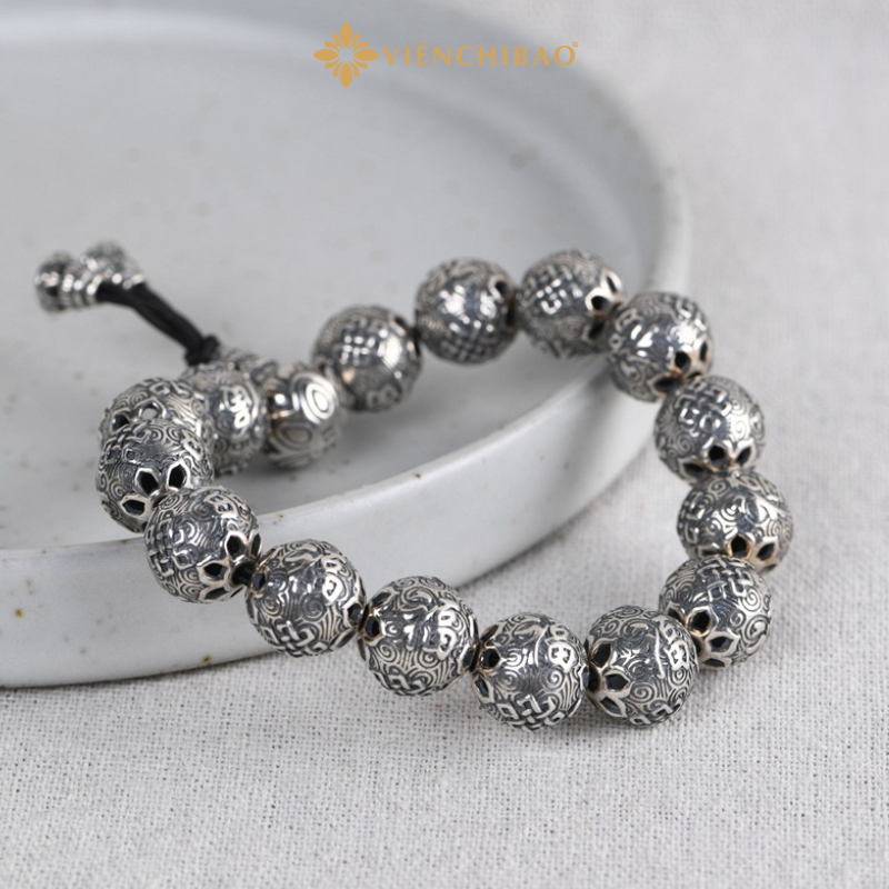 Vòng Tay Chuỗi Khắc Bát Bảo Cát Tường Chữ Phúc – Viễn Chí Bảo là món trang sức phong thủy cao cấp, kết hợp hài hòa giữa giá trị thẩm mỹ và ý nghĩa tâm linh sâu sắc. Sản phẩm được chế tác từ bạc Thái S925 nguyên chất, mang đến vẻ đẹp sang trọng, bền bỉ theo thời gian. Mỗi hạt bạc trên vòng tay đều được khắc tinh xảo hình Bát Bảo, kèm chữ Phúc, tượng trưng cho sự may mắn, bình an và cát tường cho người đeo. Đây là món trang sức lý tưởng cho cả nam và nữ, vừa thời trang vừa mang giá trị phong thủy sâu sắc.