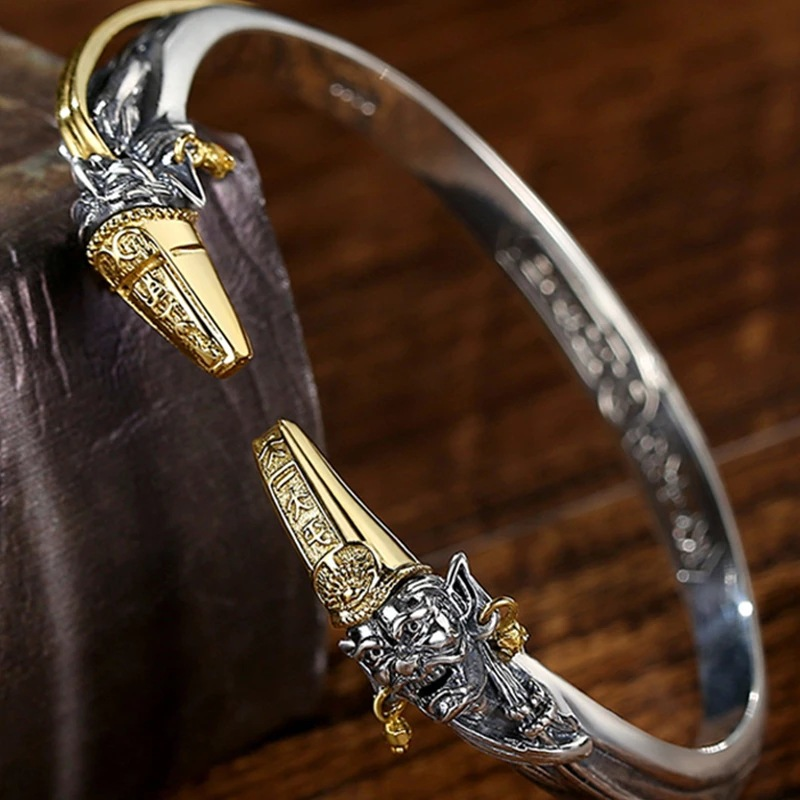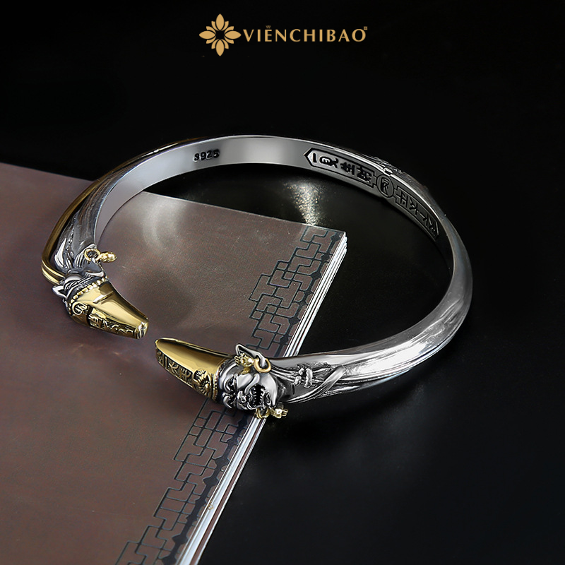 Sản phẩm được chế tác từ bạc Thái S925 cao cấp, kết hợp cùng chi tiết tạo hình đầu Hắc – Bạch Vô Thường chạm khắc thủ công tỉ mỉ, đường nét sống động và mạnh mẽ. Bề mặt bạc xử lý oxy hóa tạo hiệu ứng cổ điển, tôn lên vẻ huyền bí, trầm mặc nhưng vẫn đầy quyền lực