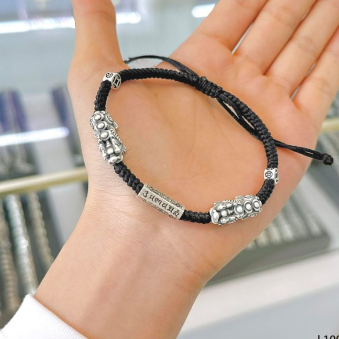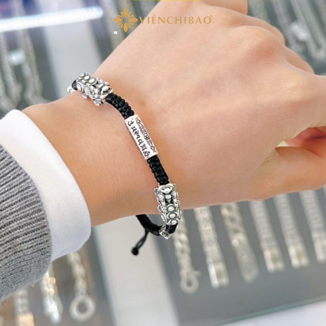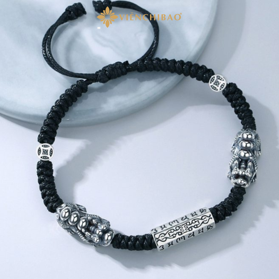 Chiếc vòng tay được thiết kế với hai linh vật Tỳ Hưu bằng bạc Thái cao cấp, biểu tượng cho sự chiêu tài giữ lộc, xua đuổi tà khí và bảo vệ chủ nhân. Chính giữa là hạt chủ Lục Tự Chân Ngôn – câu thần chú thiêng liêng trong Phật giáo Tây Tạng, mang lại sự bình an, may mắn và vượng khí.